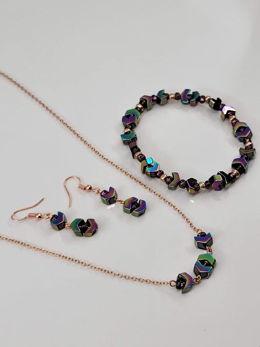 Multicolor Metal & Rose Gold Jewelry Set - Matching Necklace, Bracelet & Earrings