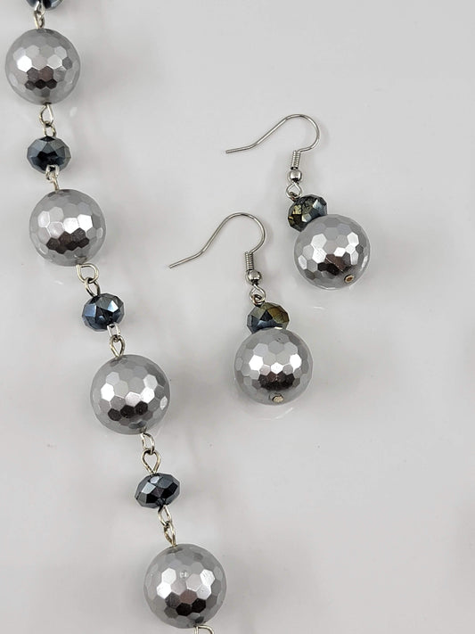 Silver Disco & Black Crystal Jewelry Set - Matching Necklace & Earrings