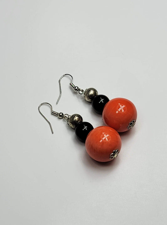 Orange Ceramic & Black Glass Bead Earrings - One of a kind