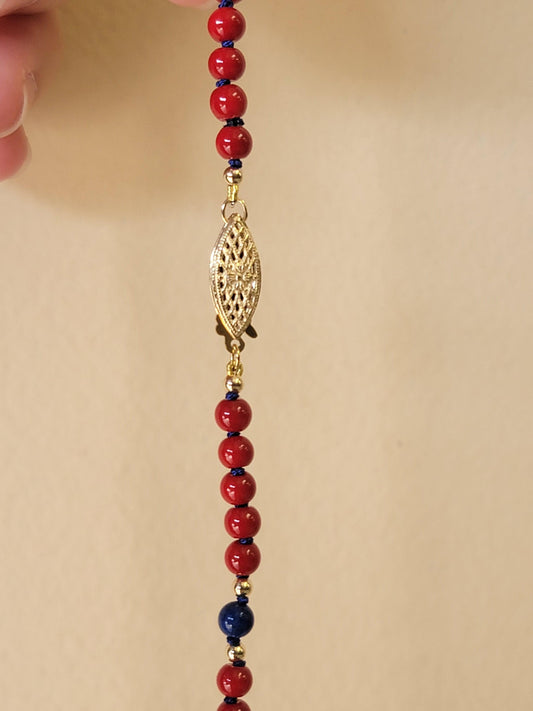 Red Czech & Lapis - 14kt Yellow Gold-Filled Accents - Hand-tied Double Knotted Necklace