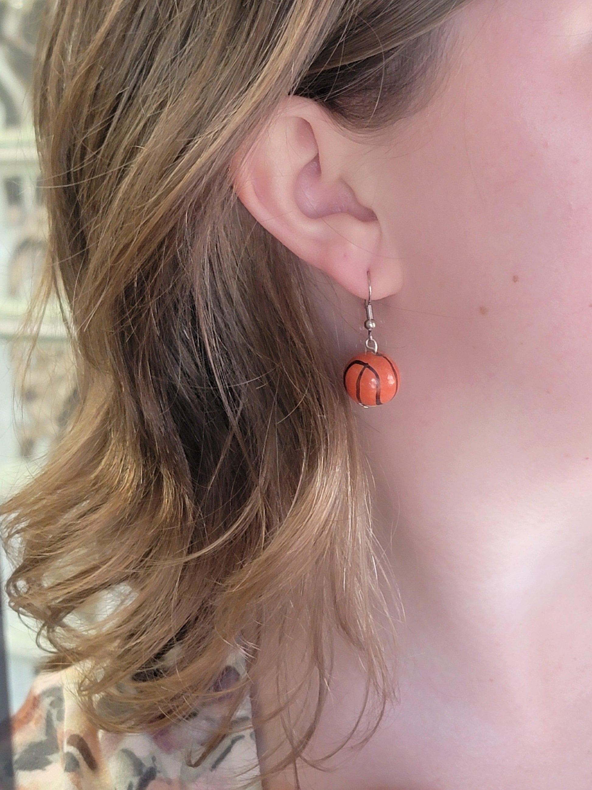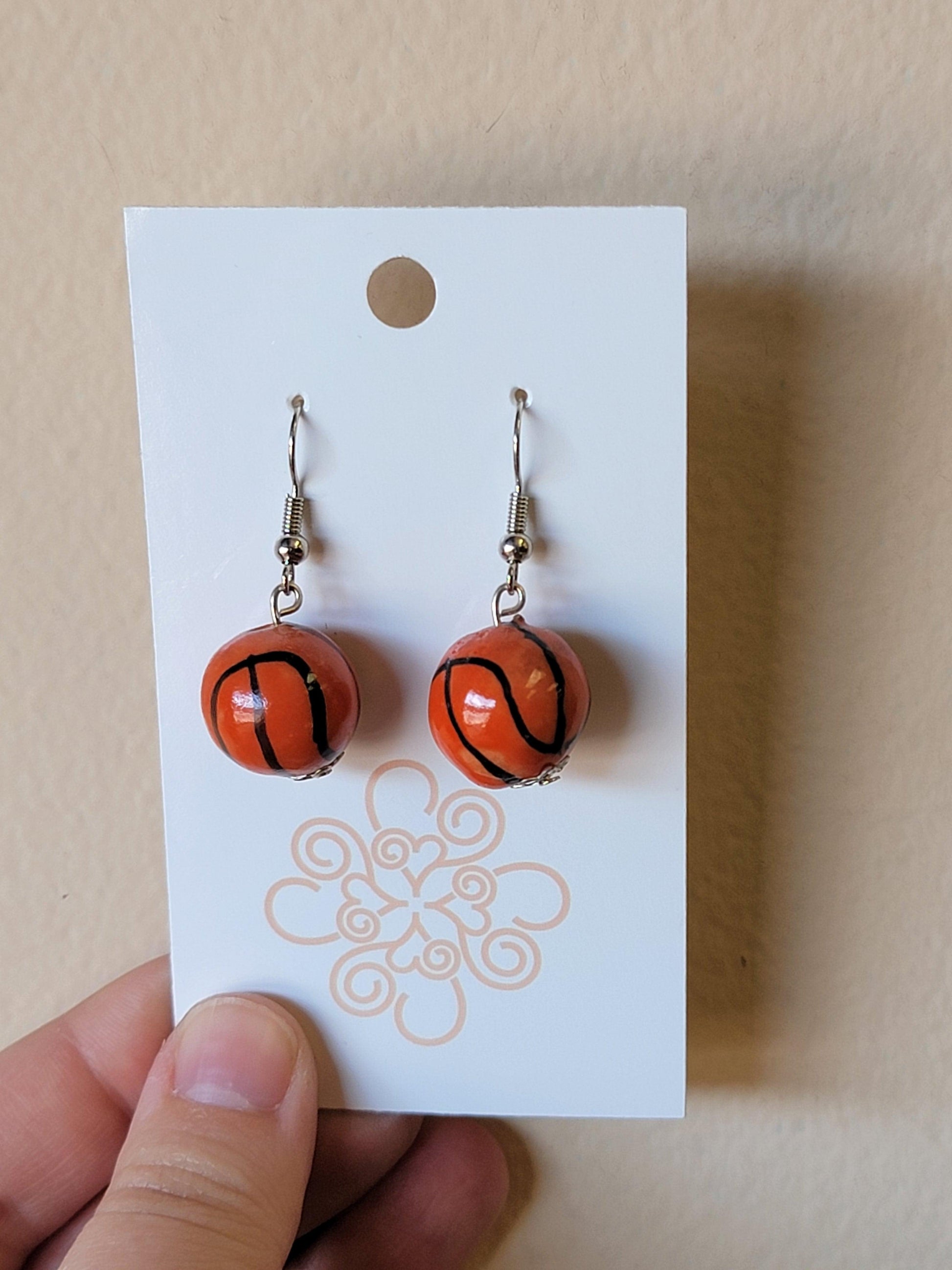 Handpainted glass bead basketball earrings with silver hypoallergenic and nickel-free hooks. Also available in other styles