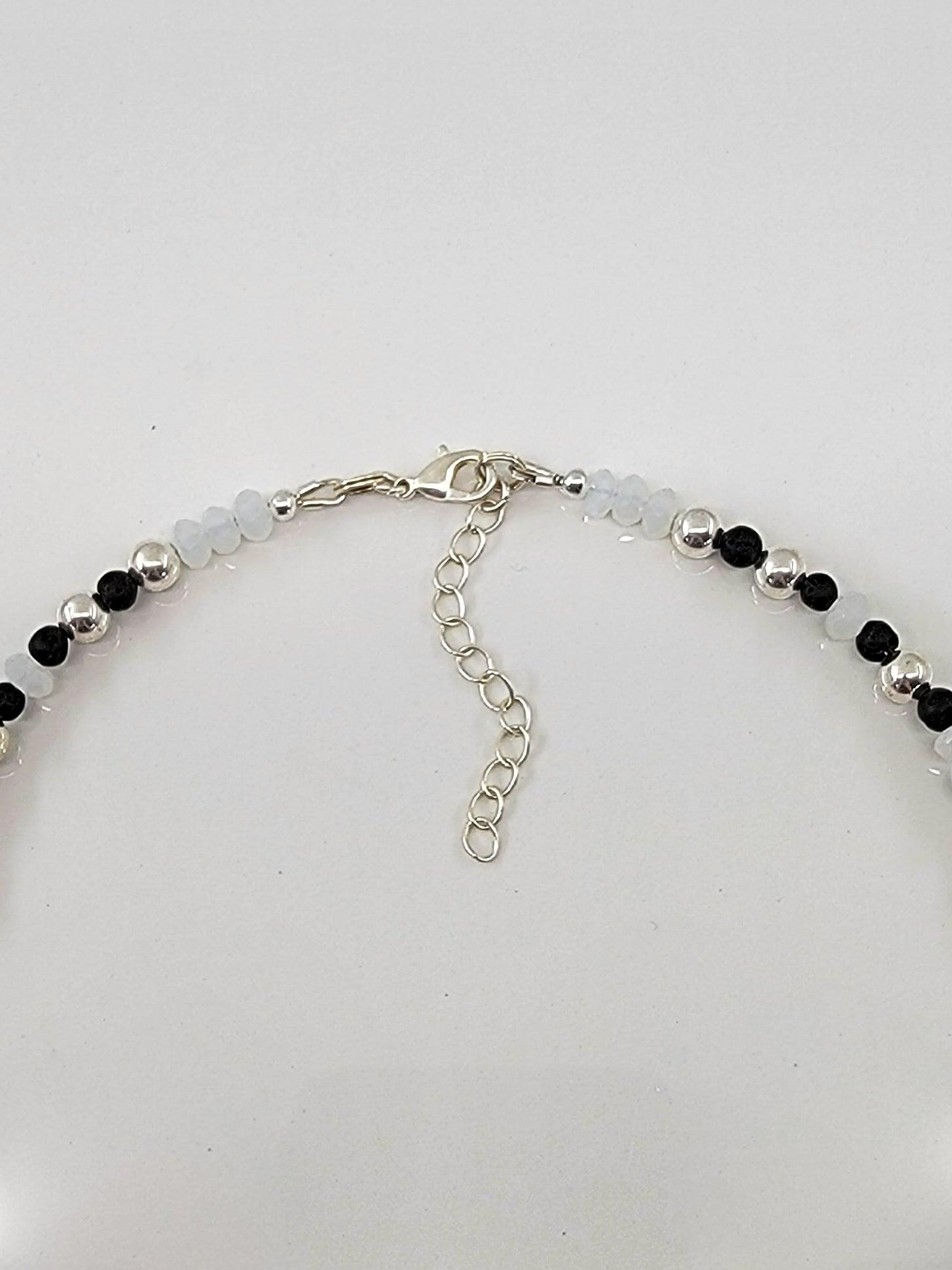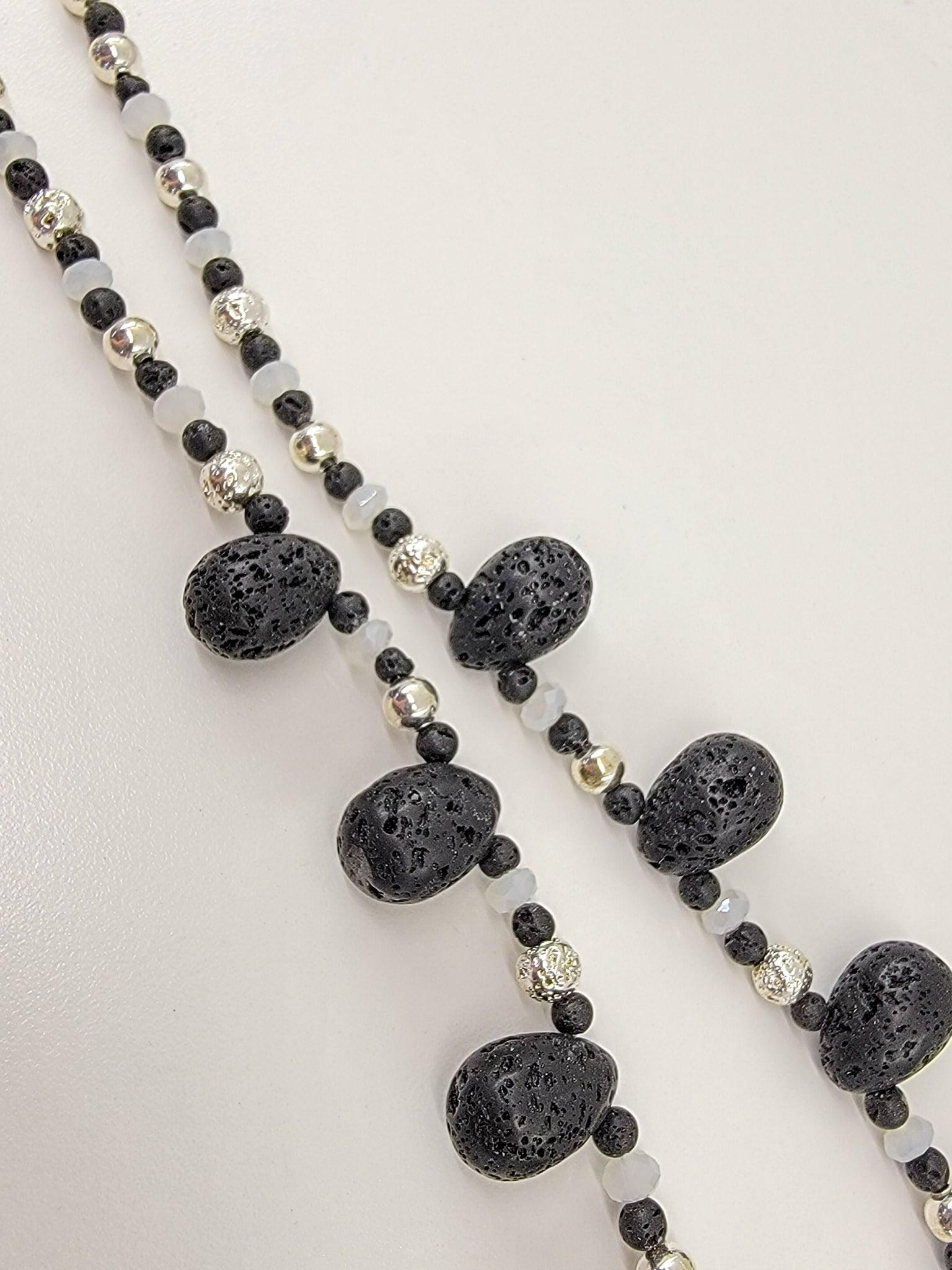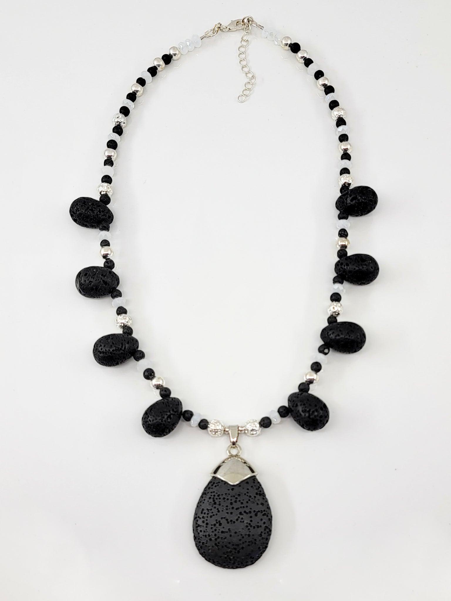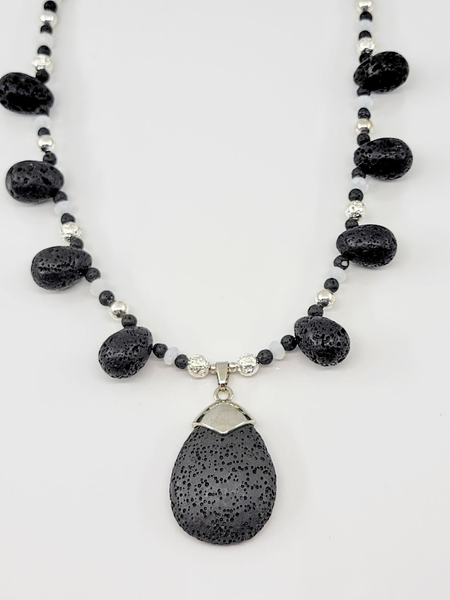 This one-of-a-kind necklace features a large lava stone teardrop pendant, eight smaller teardrop stones placed evenly between tiny lave stone beads, and white glass crystals. Lightweight due to the type of material and comfortable to wear.