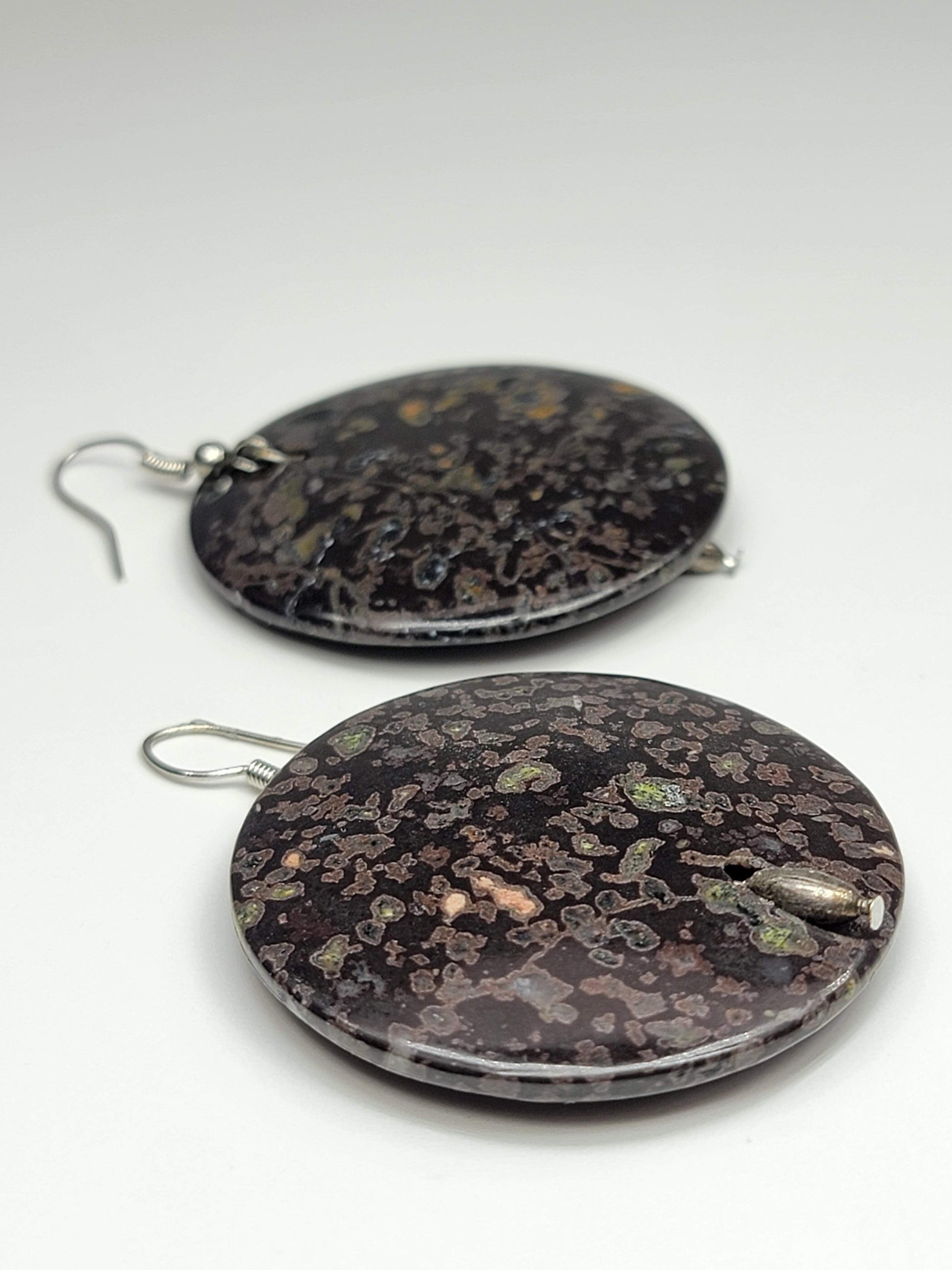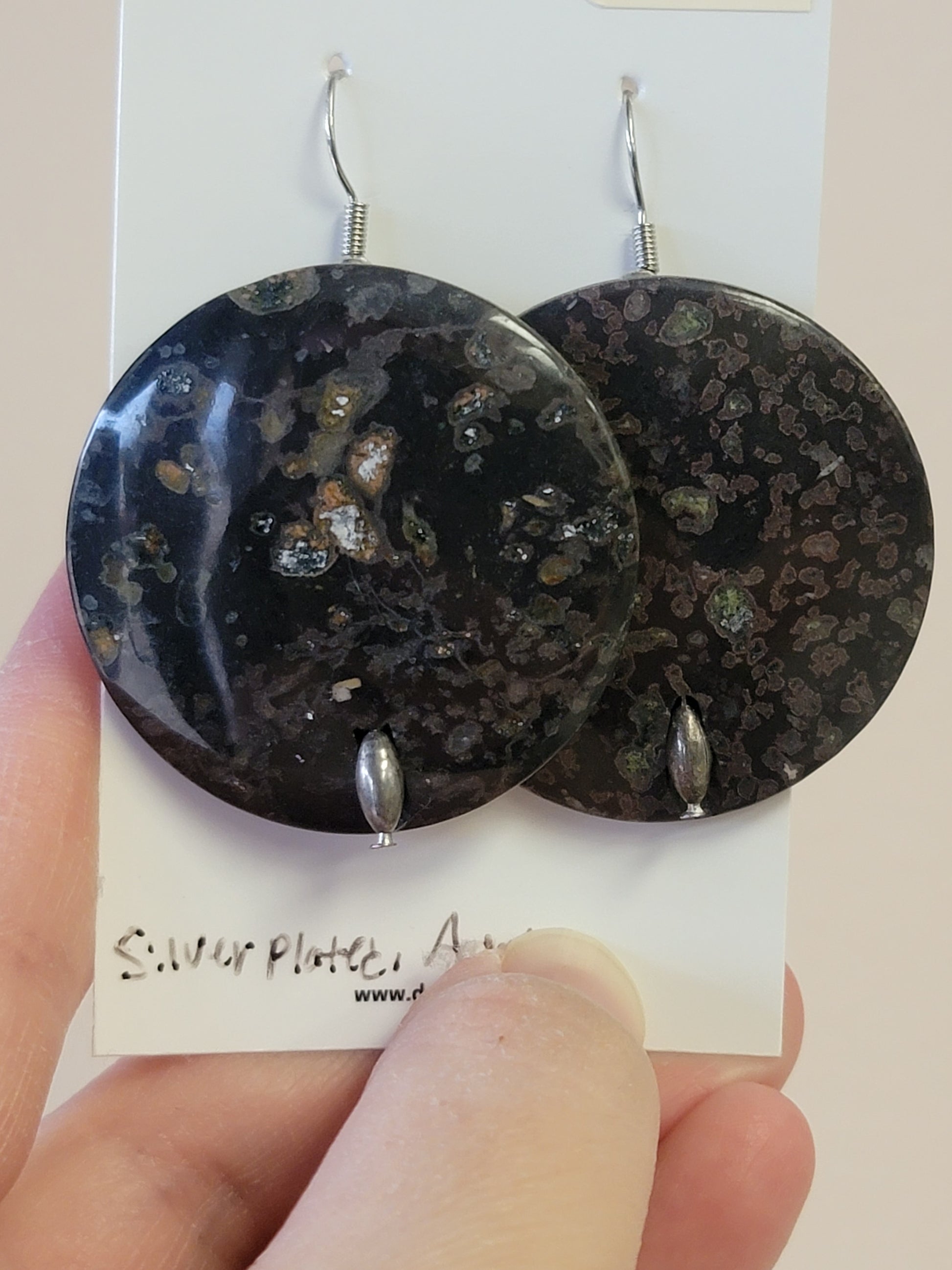 These unique and dynamic earrings are made with black flat round disc agate stone beads, and hypoallergenic and nickel-free silver plated hooks.