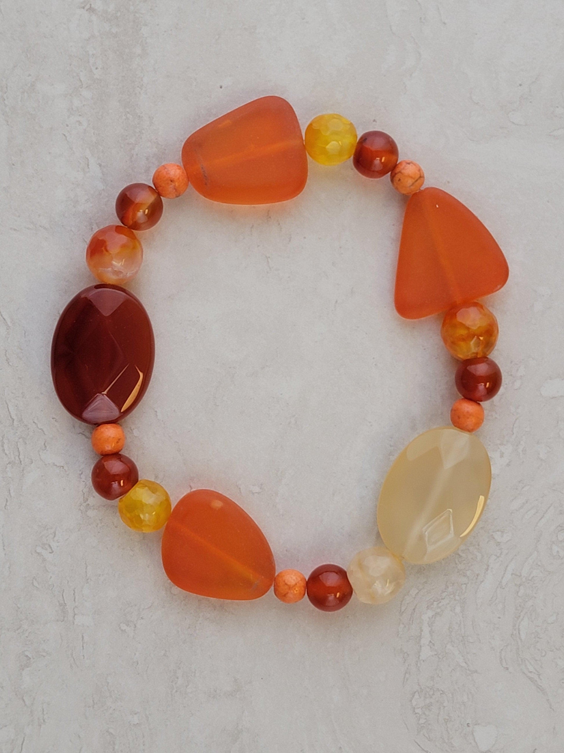 One-of-a-kind elastic bracelet made with orange stone and unique sea glass beads.