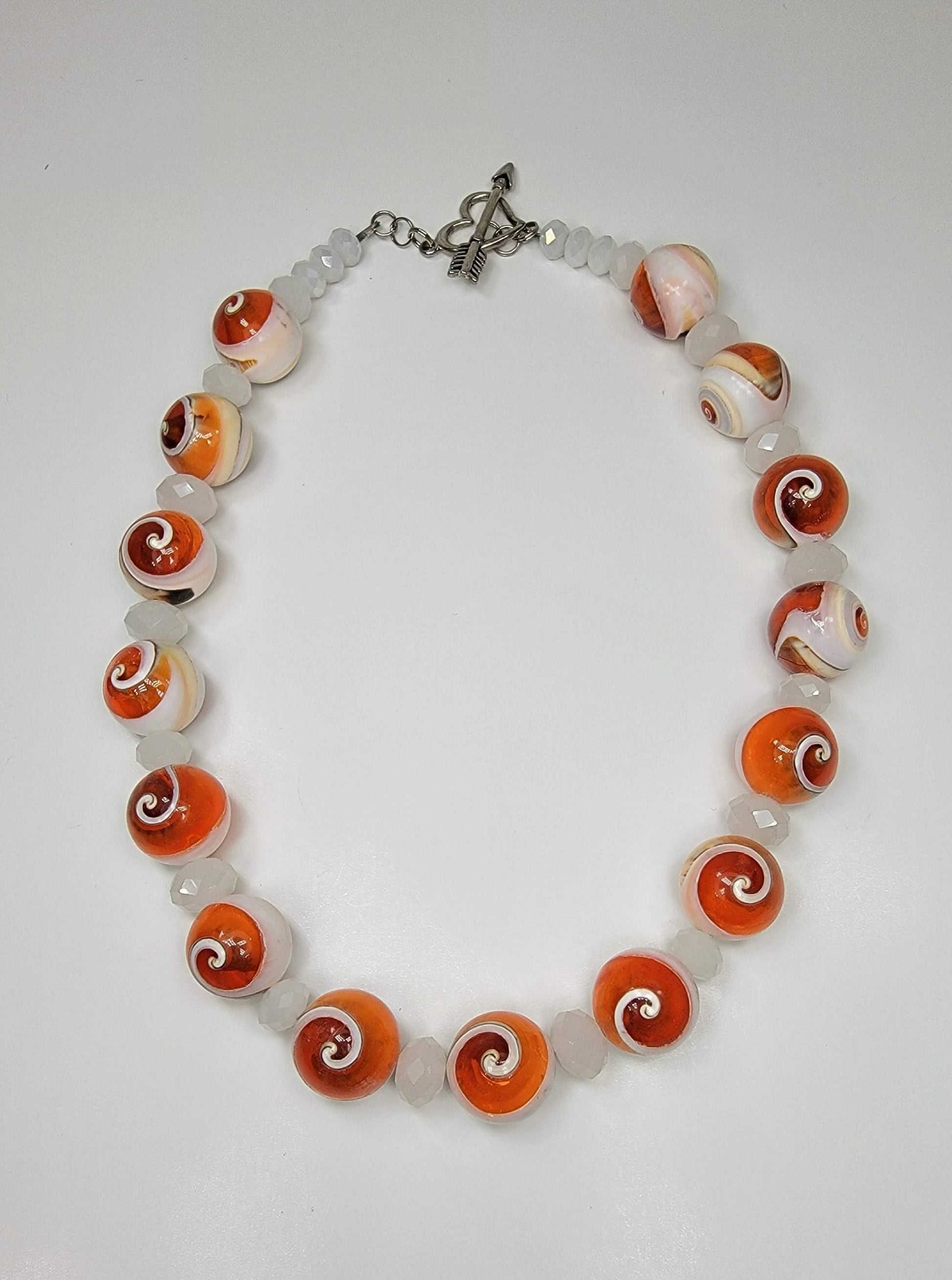 This one-of-a-kind necklace is made with orange and white sea shell beads, and a silver-plated heart-shaped toggle clasp.