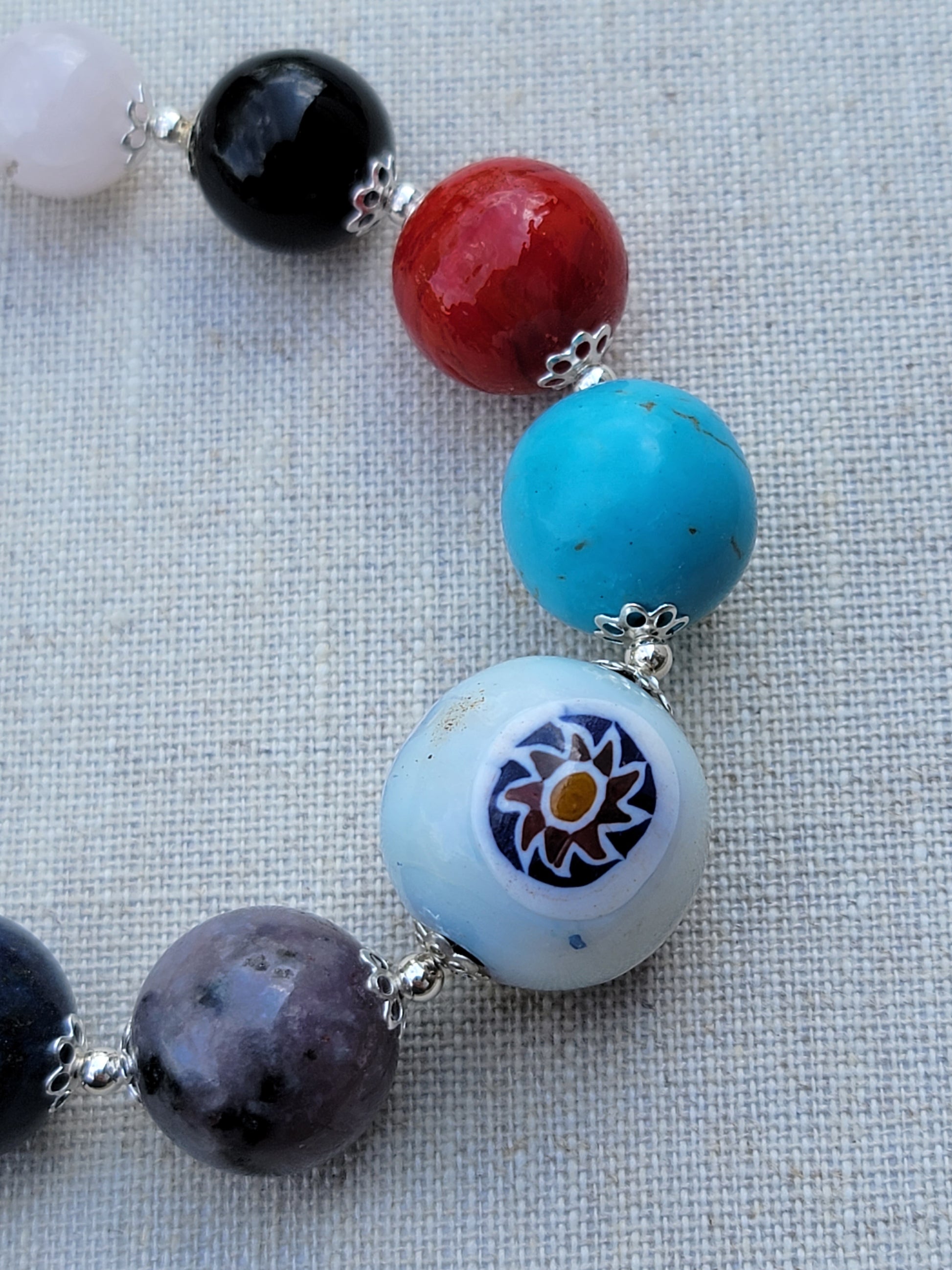 Every necklace is composed of one bead of each kind, making each strand a unique record of materials gathered over time. The beads are intentionally graduated in size, beginning small and understated at the clasp and gradually building toward a bold center focal point, creating a natural balance, comfort, and visual flow.